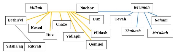 Nonetheless, we have a strong link here between the descendants of Nachor – whose son Bethu’el would father a daughter named Rivqah (Rebekah) who would marry Yitschaq, and be a mother to both Esau and Ya`aqov, favoring Ya`aqov over Esau – Ya`aqov would then go on to father twelve patriarchs of the tribes of Yashar’el.