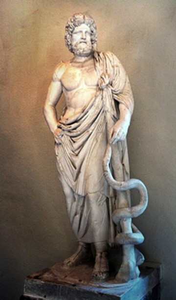 La madre mortale di Esculapio, il cui nome è Coronis (!), mentre era incinta di Esculapio, sposò un uomo mortale. Apollo quindi colpì sia Coronis che suo marito. Mentre il corpo di Coronis giaceva bruciato sulla pira funeraria, Apollo eseguì il primo taglio Cesario, liberando il bambino Esculapio dal grembo di sua madre e da morte certa. Il simbolo di Esculapio è il singolo serpente avvolto attorno al palo ed è uno dei due simboli della medicina che caratterizzano il serpente. Quei medici e assistenti che servivano questo dio erano conosciuti come i Terapeuti di Esculapio.