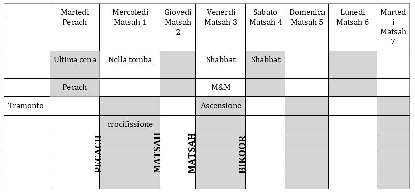 Quando si comprende il momento della crocifissione, possiamo vedere che il Mashiach è stato posto nella tomba poco prima dell'inizio dell'alto Shabbath di Matstsah (mercoledì nel tardo pomeriggio), che lo ha posto nella tomba esattamente per tre notti e tre giorni, la sua ascensione ha luogo esattamente 72 ore dopo, alla fine dello Shabbath di Sabato, poco prima dello Shabbath di Bikoor, o Primizie, che cade sempre di Domenica.